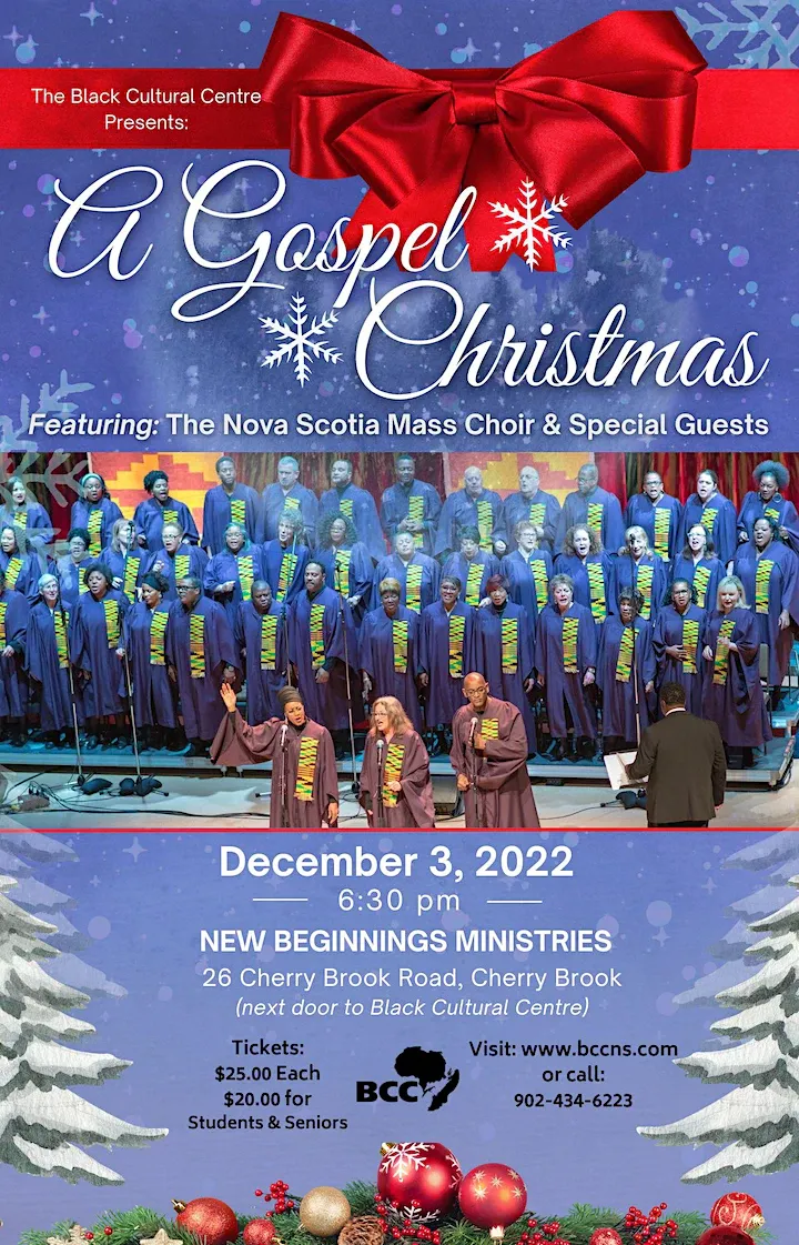 The Black Cultural Centre for Nova Scotia is pleased to present: A Gospel Christmas, featuring the Nova Scotia Mass Choir & special guests. The concert will be in collaboration with New Beginnings Ministries.