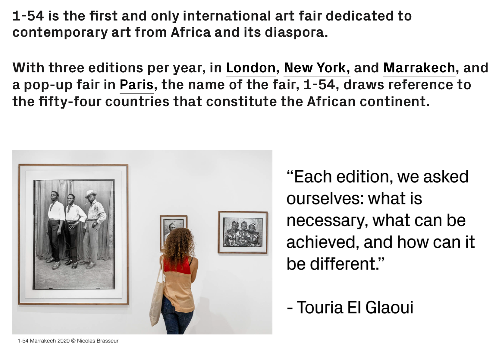 1-54, founded by Touria El Glaoui, has held annual editions in London since 2013, New York since 2015, and Marrakech since 2018. Celebrating its 10th anniversary, 1-54 spearheaded the ascent of contemporary African art on the international art market and became a leading voice.