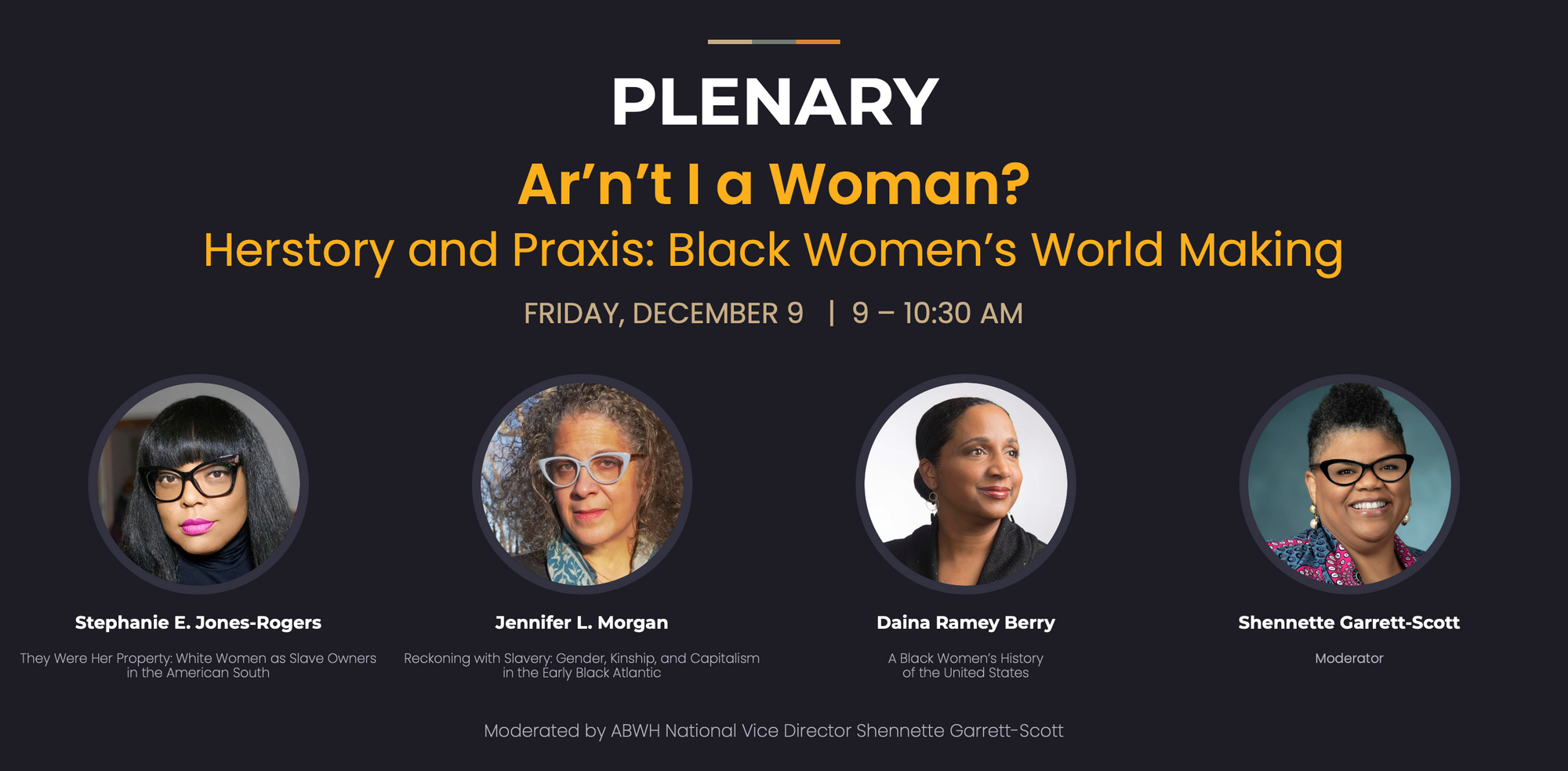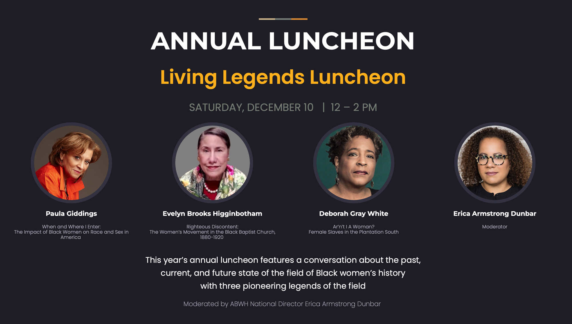 This year, the annual luncheon is the Living Legends Luncheon featuring special guests Paula Giddings, Evelyn Brooks Higginbotham, and Deborah Gray White. ABWH National Director Erica Armstrong Dunbar will moderate what promises to be an exciting conversation. The luncheon will be held on Saturday, December 10 at 12 noon.
